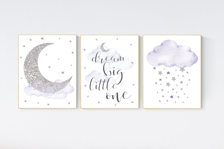 Nursery decor girl, moon and stars, Purple silver, lilac silver, baby room decor girl, lavender, cloud and stars, baby room, girl room ideas