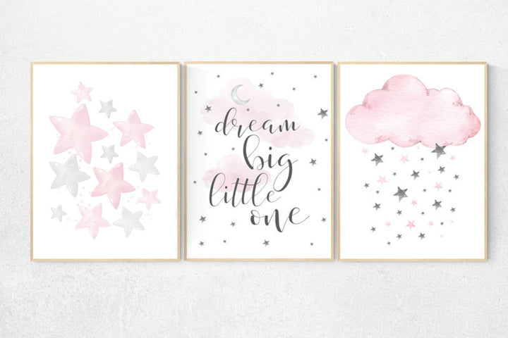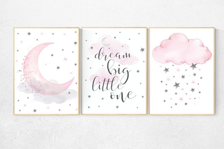 Nursery decor girl, pink and gray, nursery decor girl pink, pink nursery, dream big little one, moon and stars, baby room, girl nursery