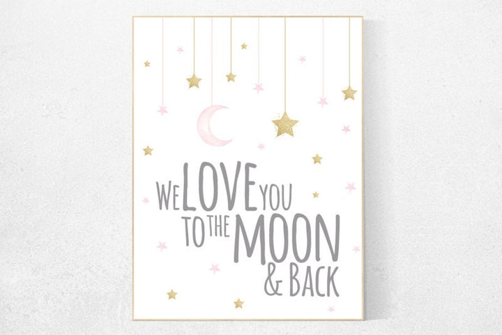 Nursery decor girl, pink and gold nursery, we love you to the moon and back, pink nursery art, cloud and stars, baby room decor