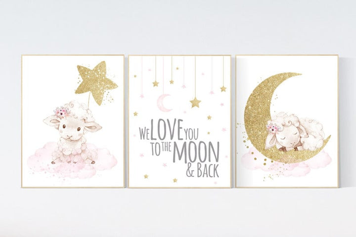 Nursery decor girl, Pink gold nursery decor, Sheep nursery decor, lambs, we love you to the moon and back, nursery wall art, moon cloud star