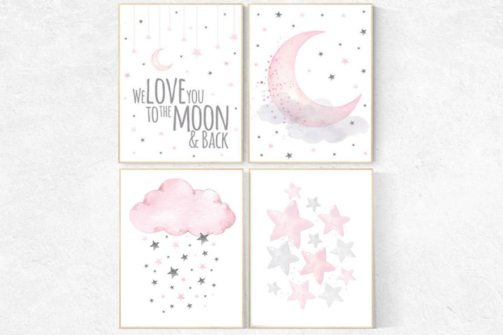 Nursery decor girl, pink grey nursery prints, Nursery wall art girl, we love you to the moon and back, pink gray nursery, moon, cloud, stars