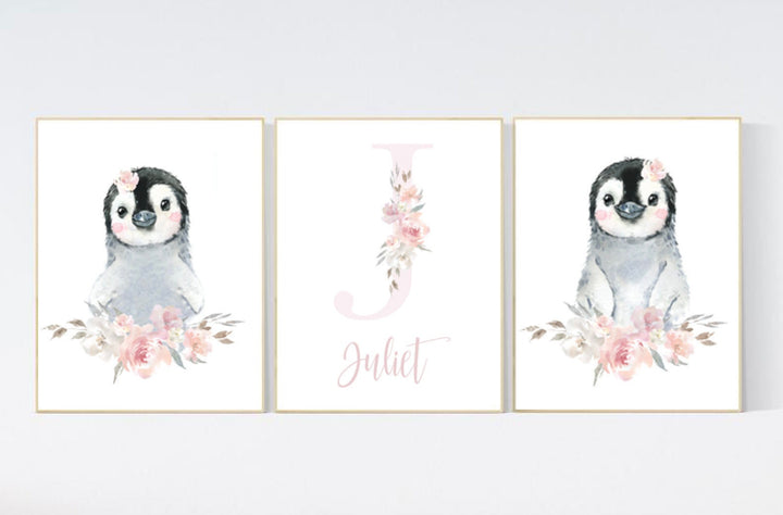 Nursery decor girl, penguin nursery, blush pink and gray nursery wall art, floral nursery, nursery decor animal, girl nursery wall decor