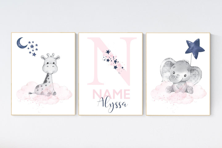 Nursery decor girl, pink and navy, elephant nursery, giraffe nursery, navy pink, twin nursery, gender neutral, animal prints, name nursery