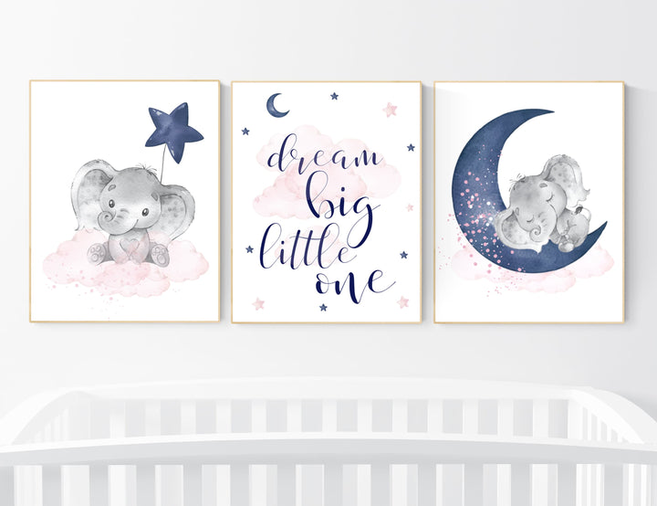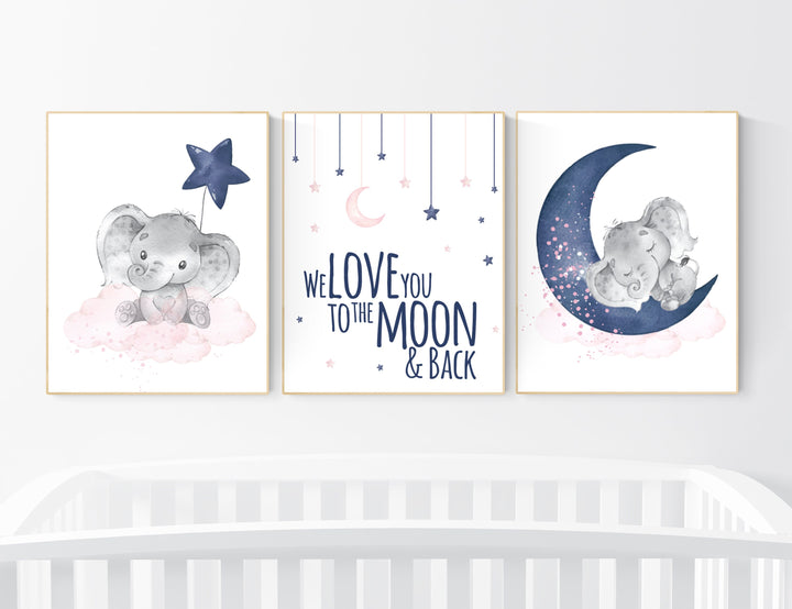 Nursery decor girl, pink and navy, elephant nursery, navy pink, animal prints, nursery wall art elephant, we love you to the moon and back