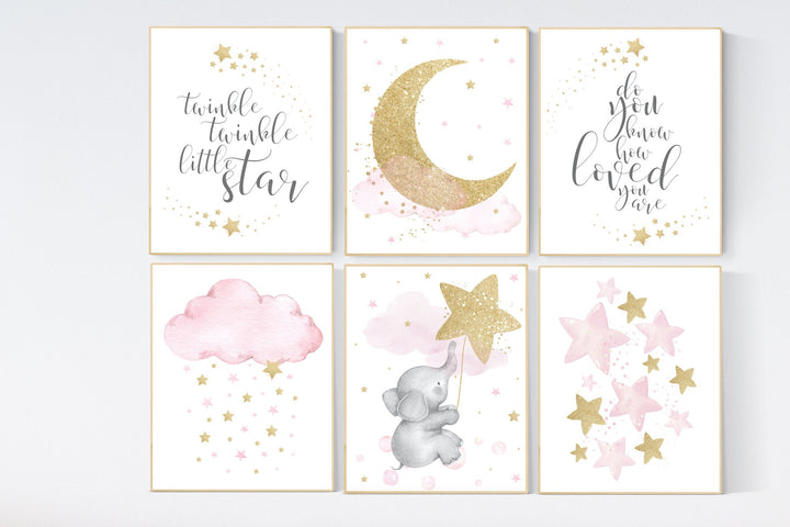 Nursery decor girl, pink gold nursery, twinkle twinkle nursery, moon and stars, elephant nursery, pink and gold, girl nursery decor ideas