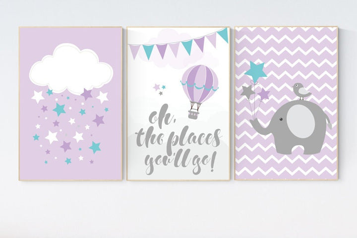 Nursery decor girl, purple aqua, purple mint, oh the places you'll go, elephant nursery, hot air balloon, elephant nursery, lilac, lavender