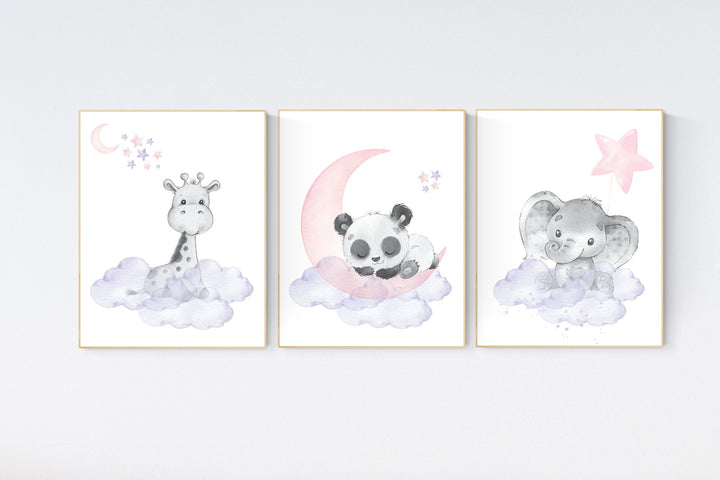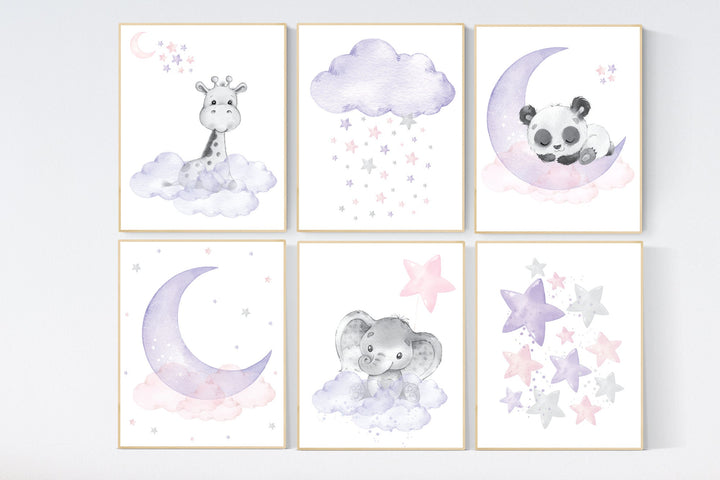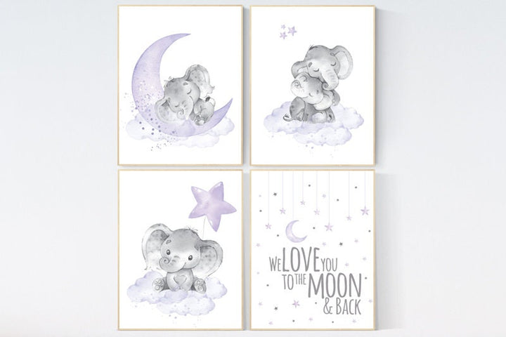 Nursery decor girl, purple nursery, nursery wall art elephant, baby room wall art, girl nursery prints, moon and stars, girl nursery art