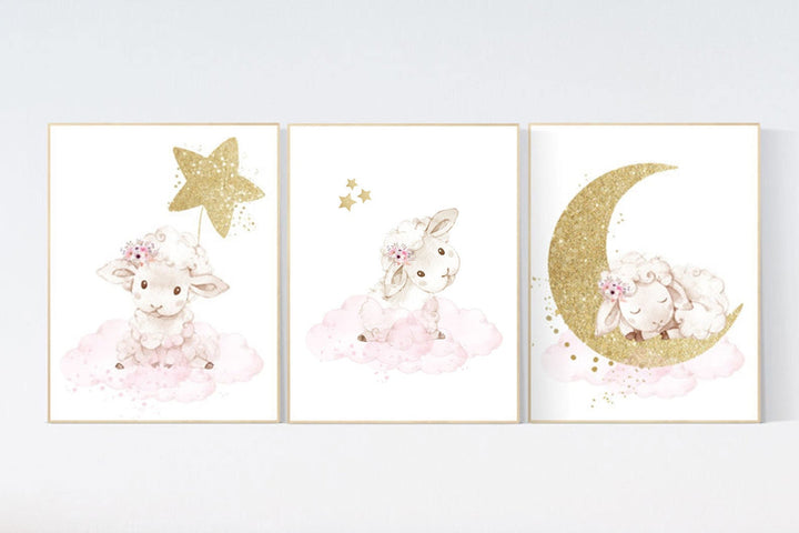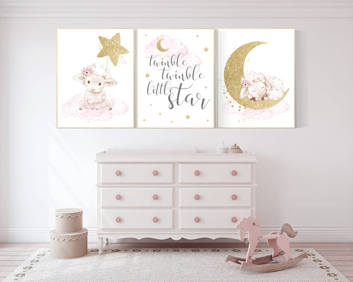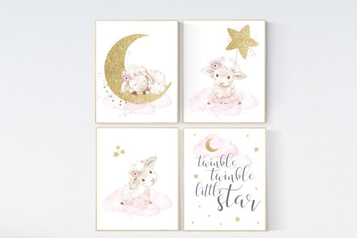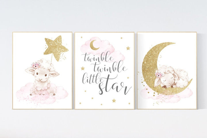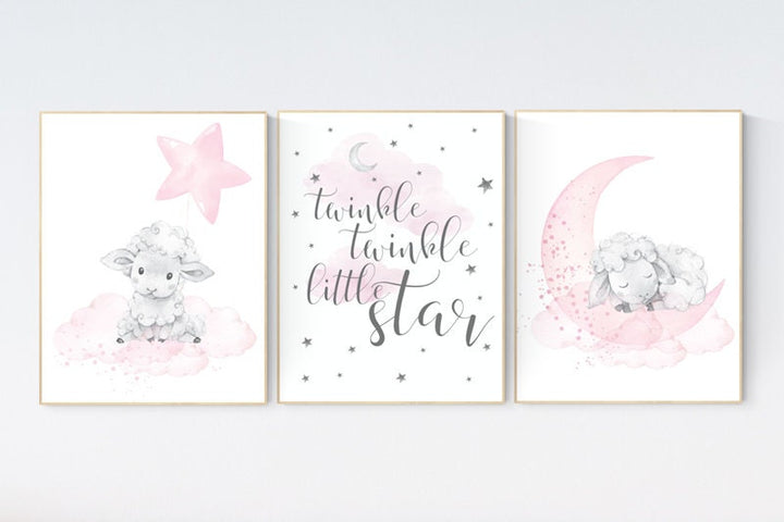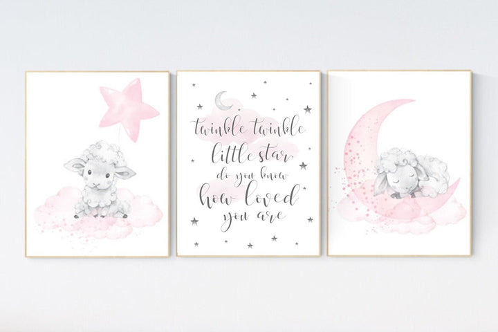 Nursery decor girl, Sheep nursery decor, nursery decor lambs, twinkle twinkle little star, nursery wall art sheep, moon and cloud