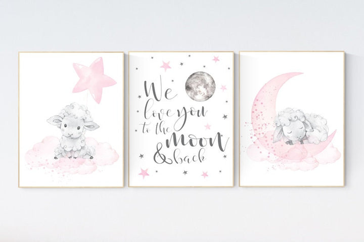 Nursery decor girl, Sheep nursery decor, nursery decor lambs, we love you to the moon and back, nursery wall art sheep, moon and cloud