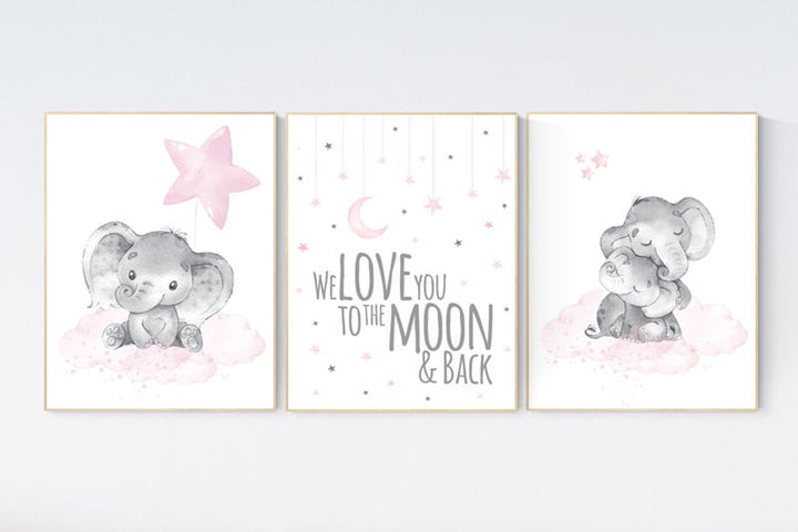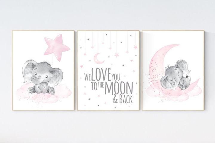 Nursery decor girl, we love you to the moon and back, baby room wall art, girl nursery decor, Elephant nursery, nursery wall art elephant