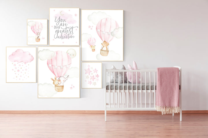 Nursery decor girl, you are our greatest adventure hot air balloon, girl nursery wall art, nursery decor woodland animals, star, moon