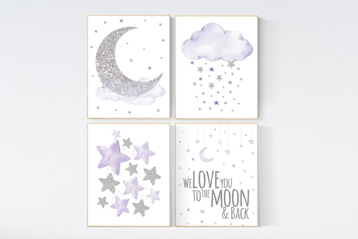 Nursery decor girl, purple nursery, Purple silver, lilac silver, baby room decor girl, lavender, cloud and stars, baby room, girl room ideas