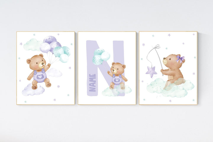 Nursery decor girl, purple and teal, nursery decor bear, teddy bear nursery, lilac nursery print, lavender, baby room decor, purple teal