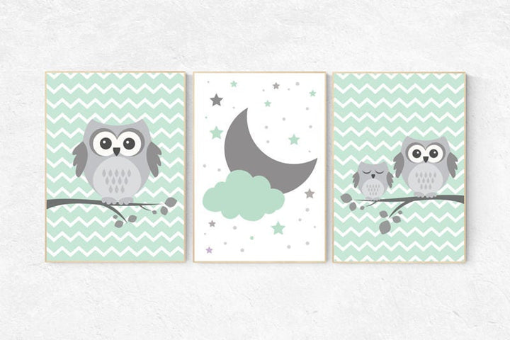 Nursery decor mint, nursery decor neutral, mint and gray nursery decor, owl nursery art, mint green nursery, green nursery, cloud and stars