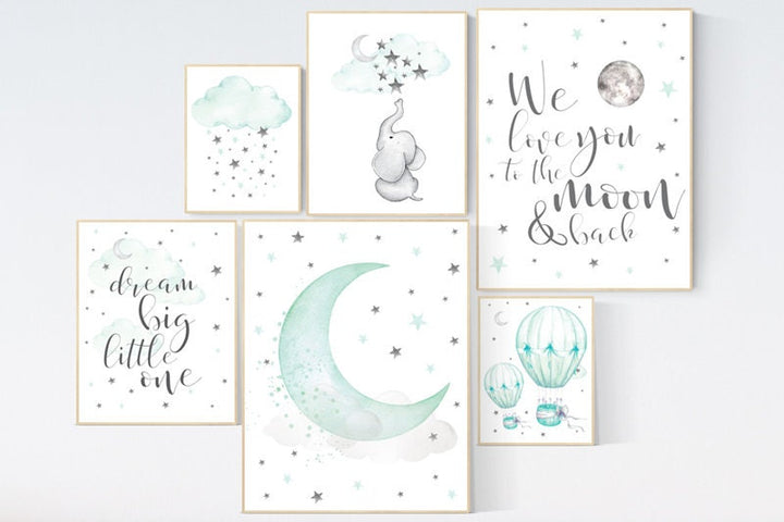 Nursery decor mint, mint green nursery, hot air balloon, dream big little one, gender neutral nursery, elephant nursery. moon and clouds