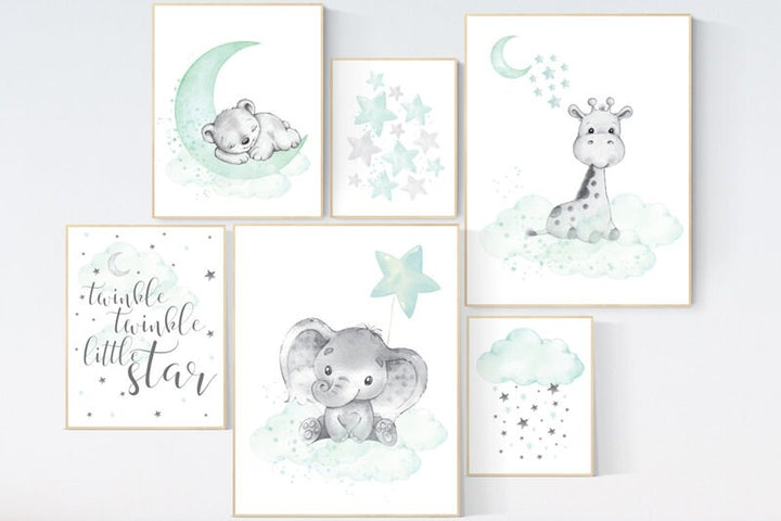 Nursery decor mint, mint green nursery, elephant, giraffe, bear nursery, twinkle twinkle little star, gender neutral nursery, cloud