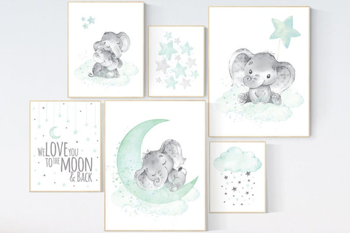 Nursery decor mint, gender neutral nursery, elephant nursery, we love you to the moon and back, nursery wall decor, twin nursery, unisex