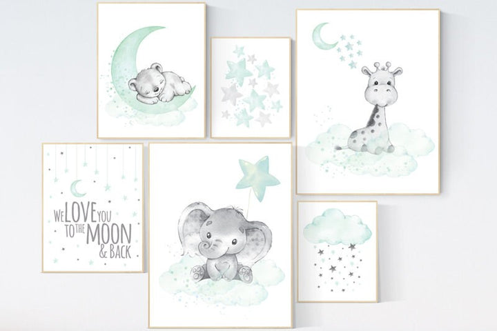 Nursery decor mint, mint green nursery, elephant, giraffe, bear nursery, we love you to the moon and back, gender neutral nursery, cloud