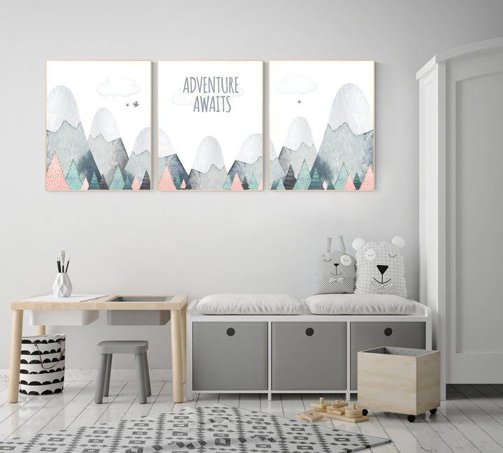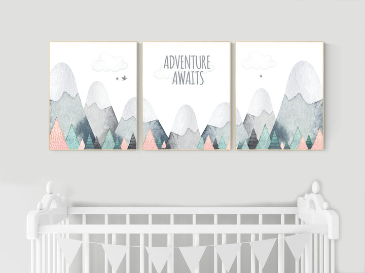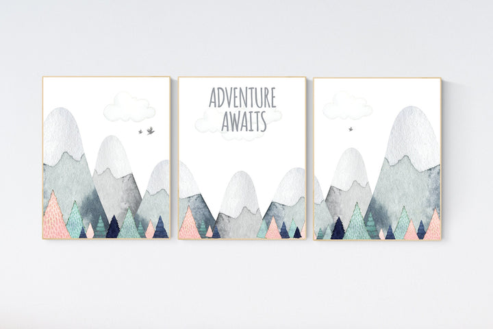 Nursery decor mountain, explore, mountain nursery wall art, woodland, adventure awaits, nursery decor neutral, baby room decor mountains