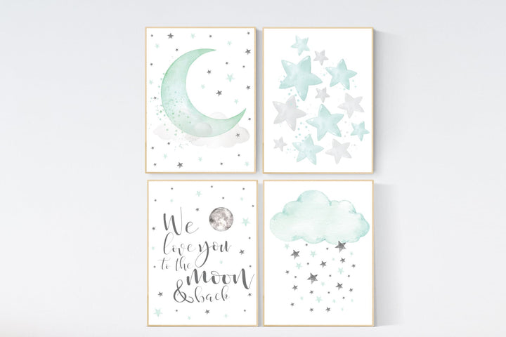 Nursery decor mint, Mint nursery, gender neutral nursery, we love you to the moon and back, mint green nursery wall art, cloud and star