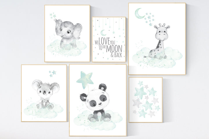 Nursery decor mint, mint green nursery, elephant, giraffe, panda, koala, we love you to the moon and back, gender neutral nursery, cloud