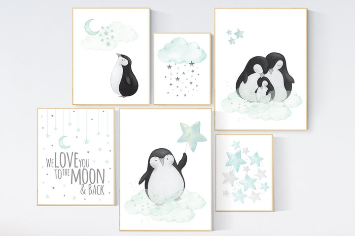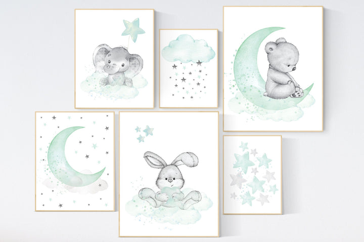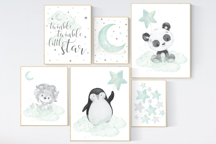 Nursery decor mint and grey, nursery wall art neutral, moon and stars, mint green, penguin, giraffe, elephant, gender neutral nursery