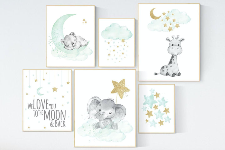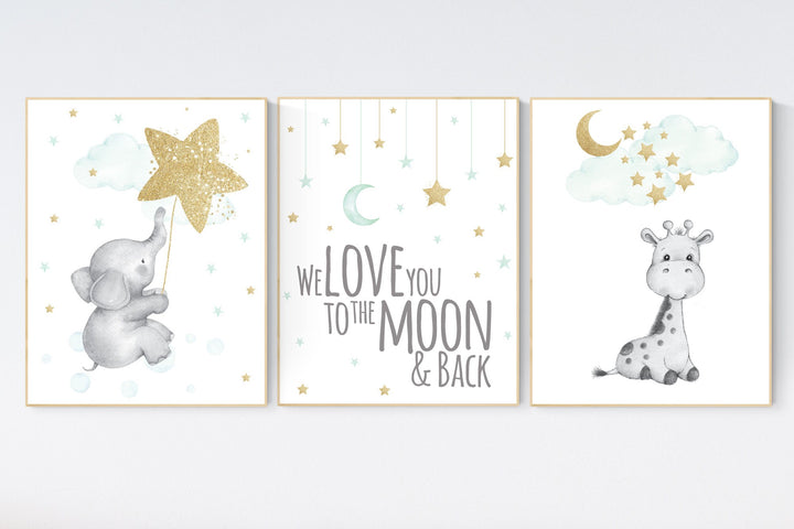Nursery decor mint gold, mint green and gold, elephant, giraffe, bear nursery, we love you to the moon and back, gender neutral nursery