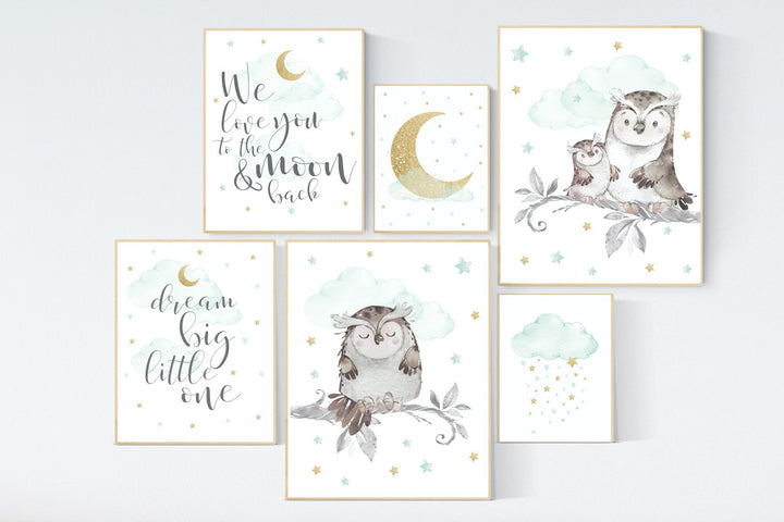 Nursery decor mint gold, mint green and gold, owl nursery, we love you to the moon and back, nursery decor owl, baby room decor, mint gold