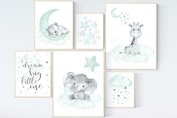 Nursery decor mint, mint green nursery, elephant, giraffe, bear nursery, dream big little one, gender neutral nursery, moon and clouds