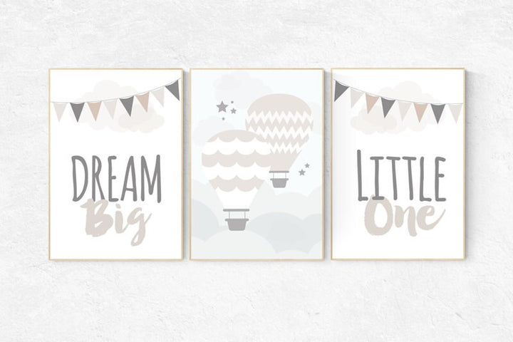 Nursery Decor neutral, Dream Big Little One, gender neutral nursery, nursery wall art hot air balloon, nursery art dream big, gray nursery