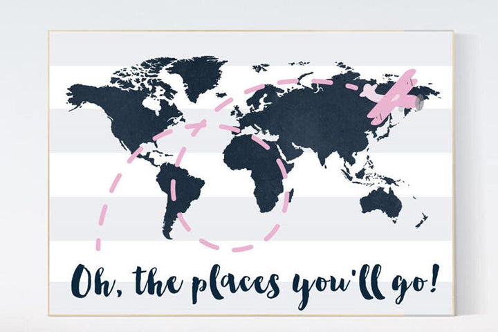 Nursery decor navy and pink, Oh the places you'll go, navy pink wall art, pink navy decor, travel nursery, nursery decor, world map nursery,