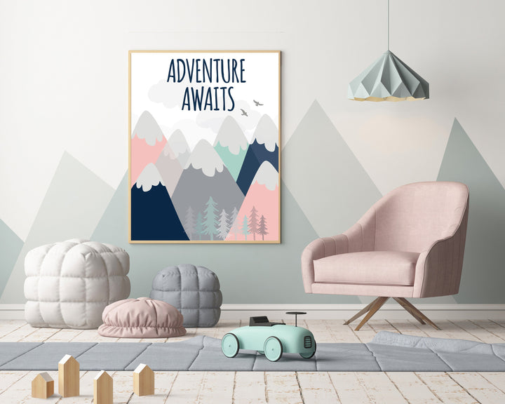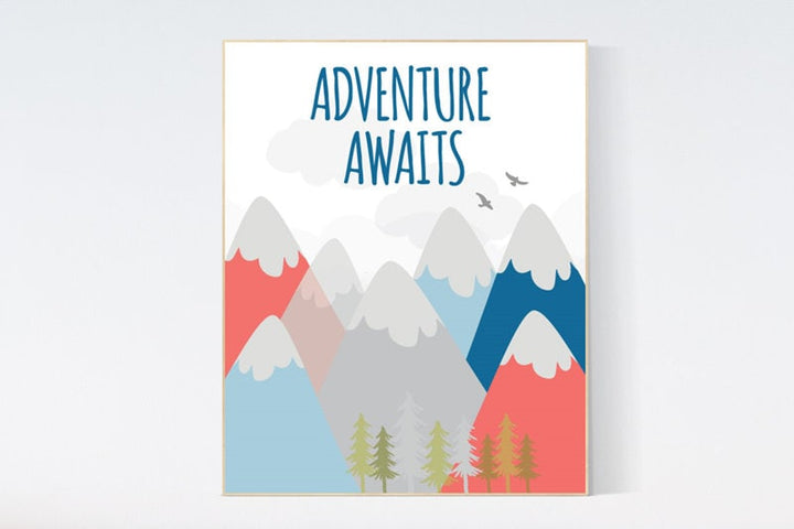 Nursery decor mountains, nursery wall art woodland, adventure awaits, baby room decor mountains, nursery decor girl coral, coral navy mint