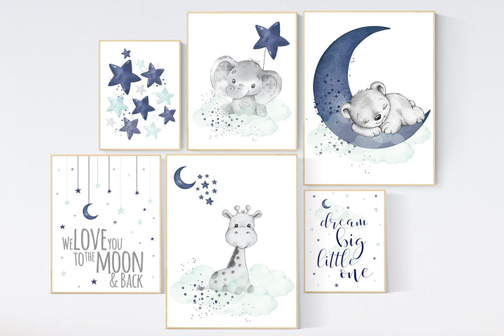 Nursery decor navy mint, navy and mint green nursery, elephant, giraffe, bear nursery, we love you to the moon and back, gender neutral