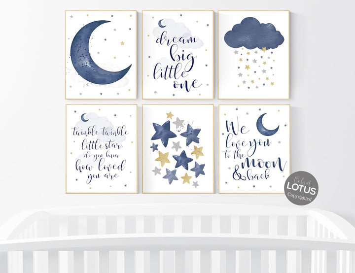 Nursery decor navy silver gold, moon and stars, navy blue, moon, cloud and stars, navy gold nursery, we love you to the moon and back
