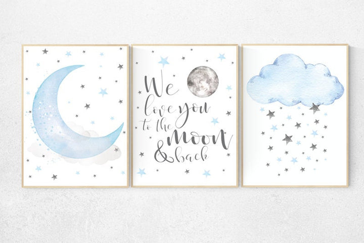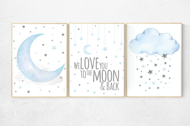 Blue and gray, Nursery decor boy, nursery decor, boys room decor, we love you to the moon and back , clouds and stars, blue grey nursery