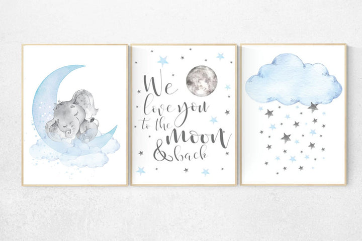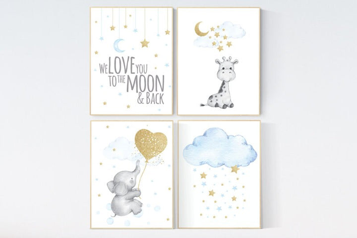 Blue and gold nursery, Nursery decor boy elephant, we love you to the moon and back, blue nursery wall art, moon and stars, giraffe nursery