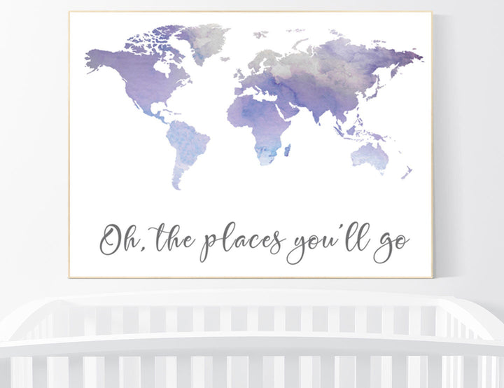 Nursery decor Purple, World map watercolor, Oh the places you will go nursery, world map nursery print, nursery art print, lilac, lavender