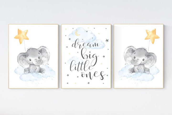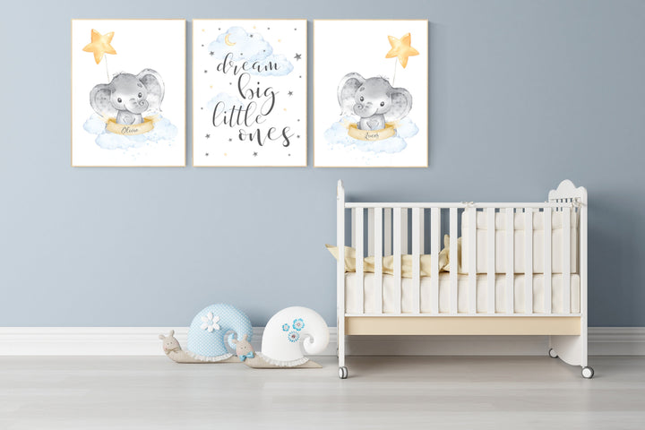 Nursery decor twins, Twin nursery, elephant nursery, moon and stars, dream big little ones, twins room decor, gender neutral, blue yellow