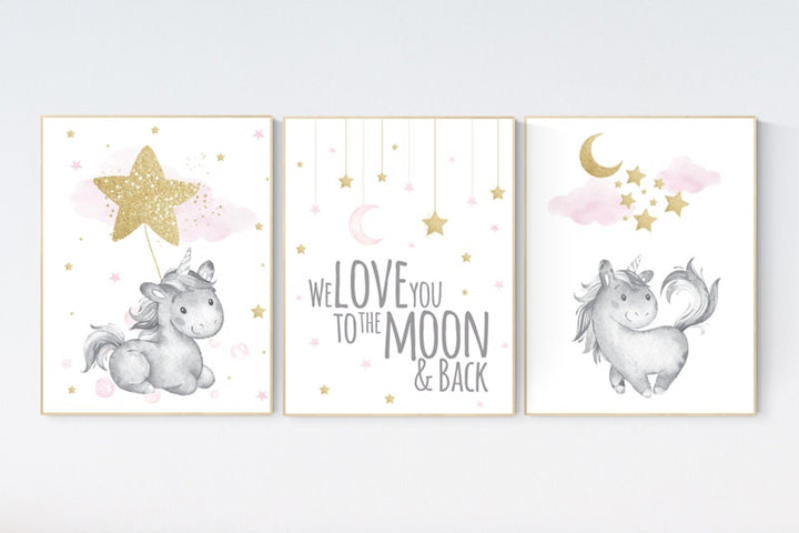 Nursery decor unicorn, baby room decor girl gold and pink, we love you to the moon and back, cloud and stars, nursery wall art unicorn