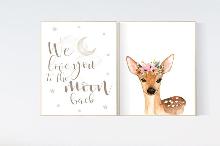 Nursery decor woodland, deer nursery decor, we love you to the moon and back, woodland nursery, deer print, Woodland Animals, deer