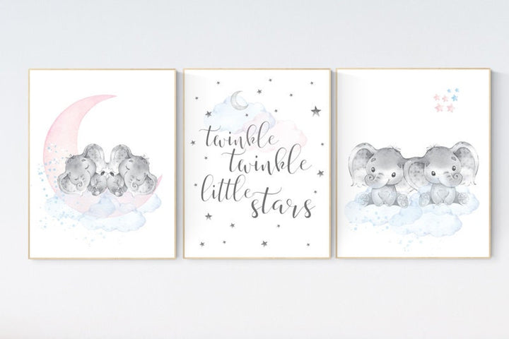 Nursery decor twins, Twin nursery, elephant nursery, moon and stars, twinkle twinkle little ones, twins room decor, blue pink, boy, girl