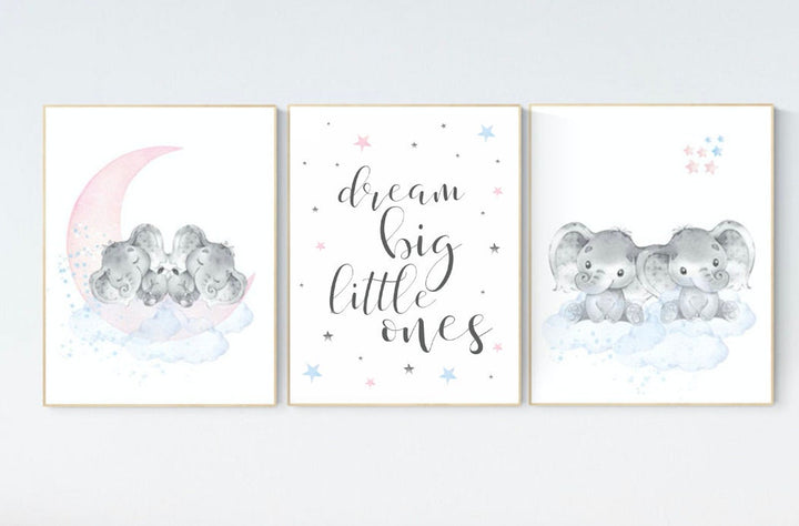 Nursery decor twins, Twin nursery, elephant nursery, moon and stars, dream big little ones, twins room decor, blue pink, boy, girl