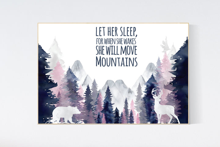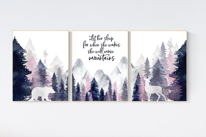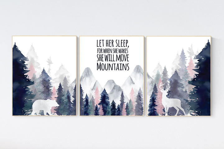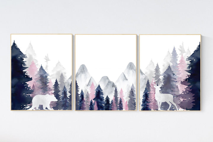 Nursery decor woodland, mountain wall art, tree nursery decor, adventure theme nursery, forest, navy and pink, woodland animals, navy pink