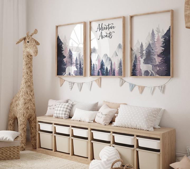 Nursery decor woodland, mountain wall art, tree nursery decor, adventure theme nursery, forest, navy, plum color, woodland animals, forest