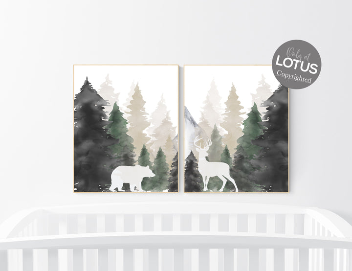 Nursery decor woodland, mountain wall art, tree nursery decor, adventure theme nursery, forest, sage green, beige, woodland animals