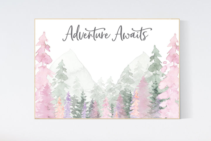 Nursery decor woodland, mountain wall art, tree nursery decor, adventure theme nursery, forest, pink, green, purple and blush pink