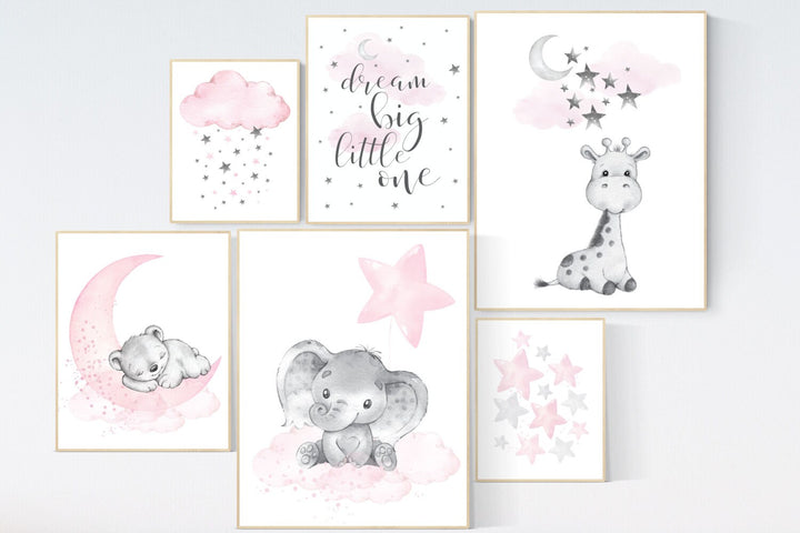 Nursery wall art animals, giraffe, bear, pink grey, nursery decor girl, moon and stars, baby room decor girl, nursery prints, pink and gray