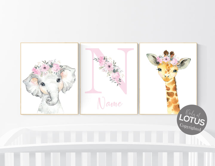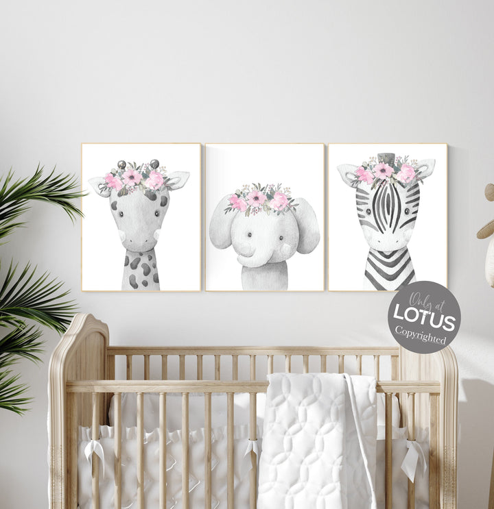 Nursery wall art animals, girl nursery decor, Safari animals, Floral Nursery Prints, pink nursery, girls nursery decor, elephant nursery