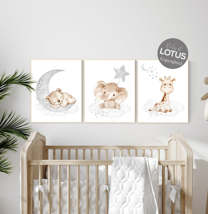 Nursery wall art animals, gray nursery, gender neutral nursery, neutral colors, beige colors, baby room decor, bear, elephant, animal prints