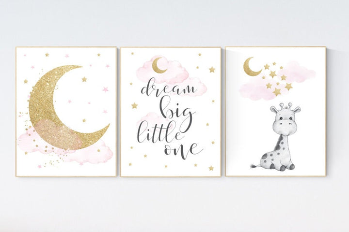 Nursery wall art girl, giraffe nursery, baby room decor girl gold and pink, dream big little one, cloud and stars, nursery wall art